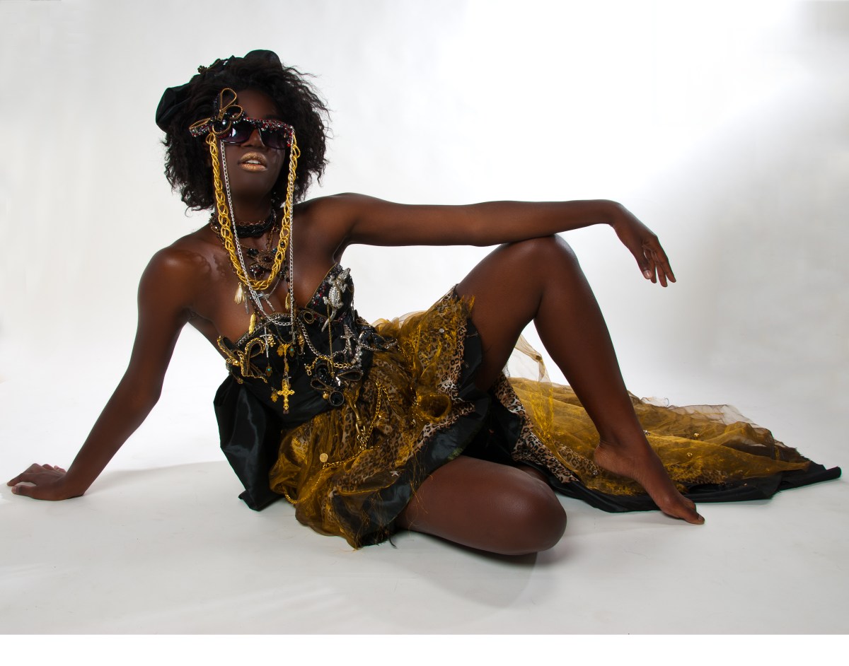 Ferosha Coutura is the quintessential image of the bad-ass amazonian goddess. Rocking a hand beaded sweetheart corset with a three tiered silk taffeta, printed silk chiffon, and iridescent gold silk organza skirt. accented with a pair of crystal encrusted sunglasses that feature a zipper flower and a ton of chain.