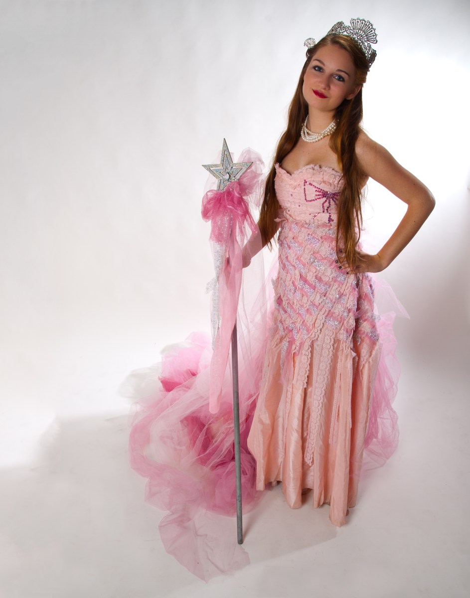 Version 1 of Glinda, the Good Witch of the North. A lace corseted bodice embellished with Swarovski crystals. Matched with a high wasted silk taffeta skirt that has a woven design and a tulle explosion for the train.