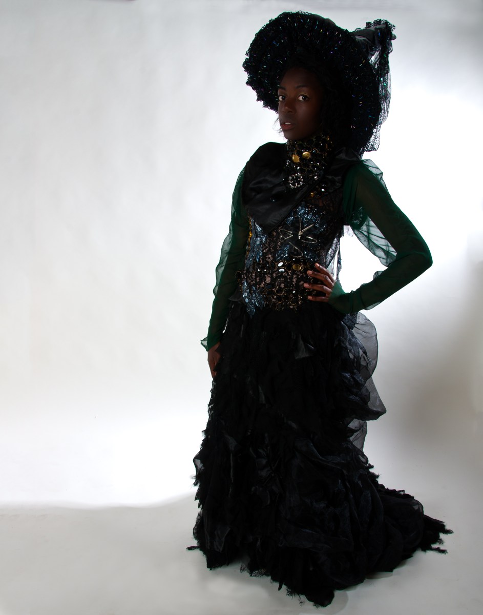 Version 2; This witch capture a more modern look as her forest green silk chiffon blouse, hand beaded corset, and silk scrap skirt, promote a futuristic theme.